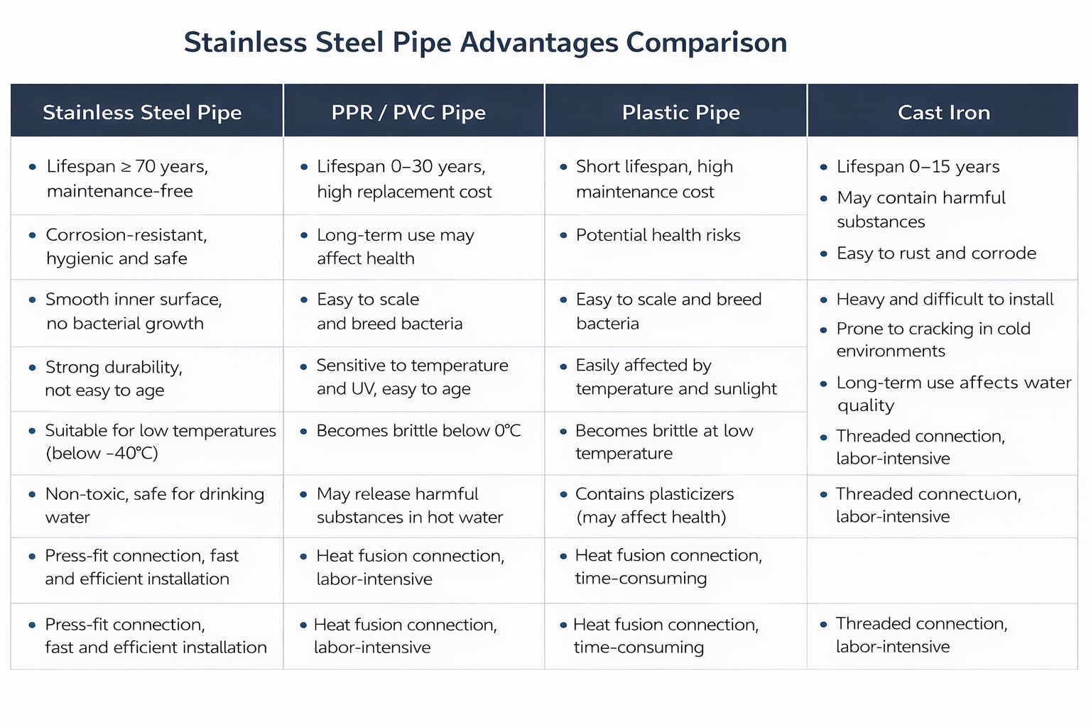 Compared with traditional galvanized pipes, they offer better corrosion resistance, cleaner water delivery, lighter weight and longer service life.